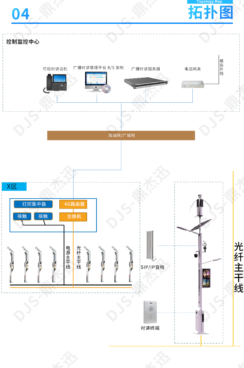 智慧燈桿一鍵報警IP廣播可視對講解決方案拓撲圖