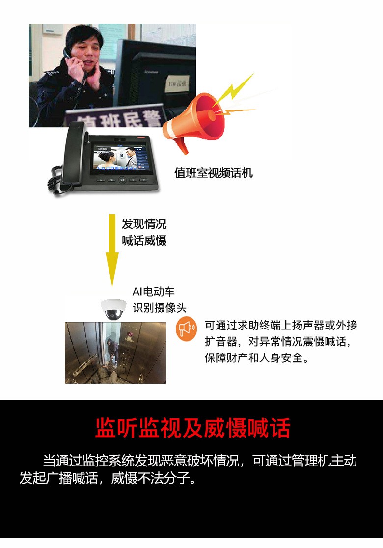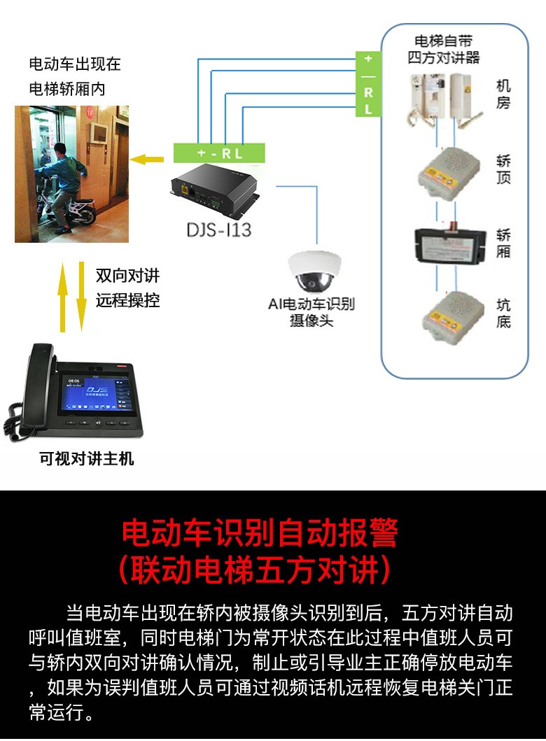 1.識別到電動車后對講控制網(wǎng)關(guān)自動呼叫值班室管理主機(jī)。 2.識別到電動車后自動語音播報警示。 3.識別到電動車后電梯不關(guān)門。