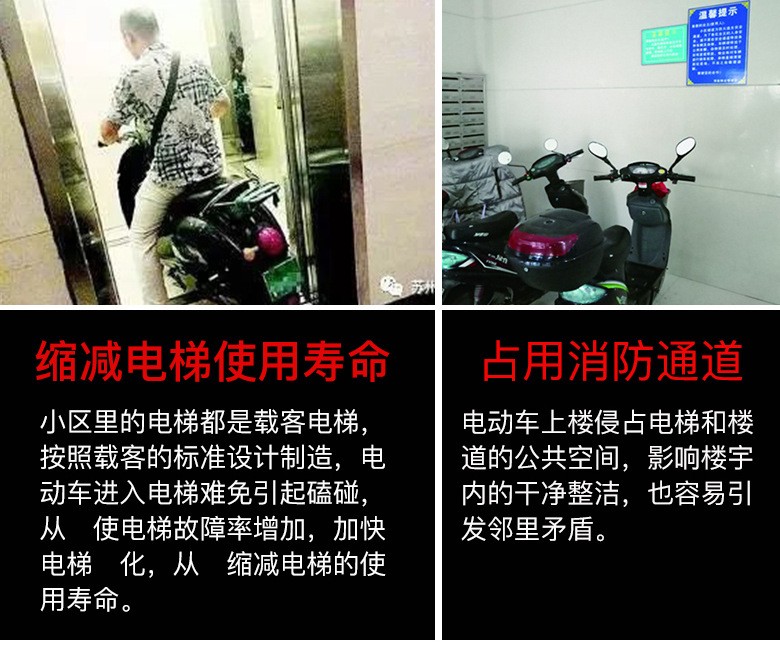 電動車停在樓道里本身就堵塞了消防通道,因電動車電路老化、充電方式不當(dāng)?shù)戎T多原因,還存在起火的風(fēng)險。一旦電動車在狹窄的樓道里起火,高層建筑內(nèi)各種豎向管井易形成“煙囪效應(yīng)”,使火勢迅速蔓延擴(kuò)大,產(chǎn)生的有毒煙氣五分鐘內(nèi)就會蔓延至整個樓道,火焰和濃煙會迅速封堵建筑的安全出口、逃生通道,給逃生增加難度。如果火災(zāi)發(fā)生樓層較高,救援的難度也會進(jìn)一步增加。  受自身體積和重量限制,電動車上樓必須借助電梯。市市場監(jiān)督管理局特種設(shè)備安全監(jiān)察科工作人員表示,小區(qū)里的電梯都是載客電梯,按照載客的標(biāo)準(zhǔn)設(shè)計制造,電動車進(jìn)入電梯難免引起磕碰,從而使電梯故障率增加,加快電梯老化,從而縮減電梯的使用壽命。一旦電梯損壞,最終損害的還是業(yè)主的利益。電動車上樓侵占電梯和樓道的公共空間,影響樓宇內(nèi)的干凈整潔,也容易引發(fā)鄰里矛盾。