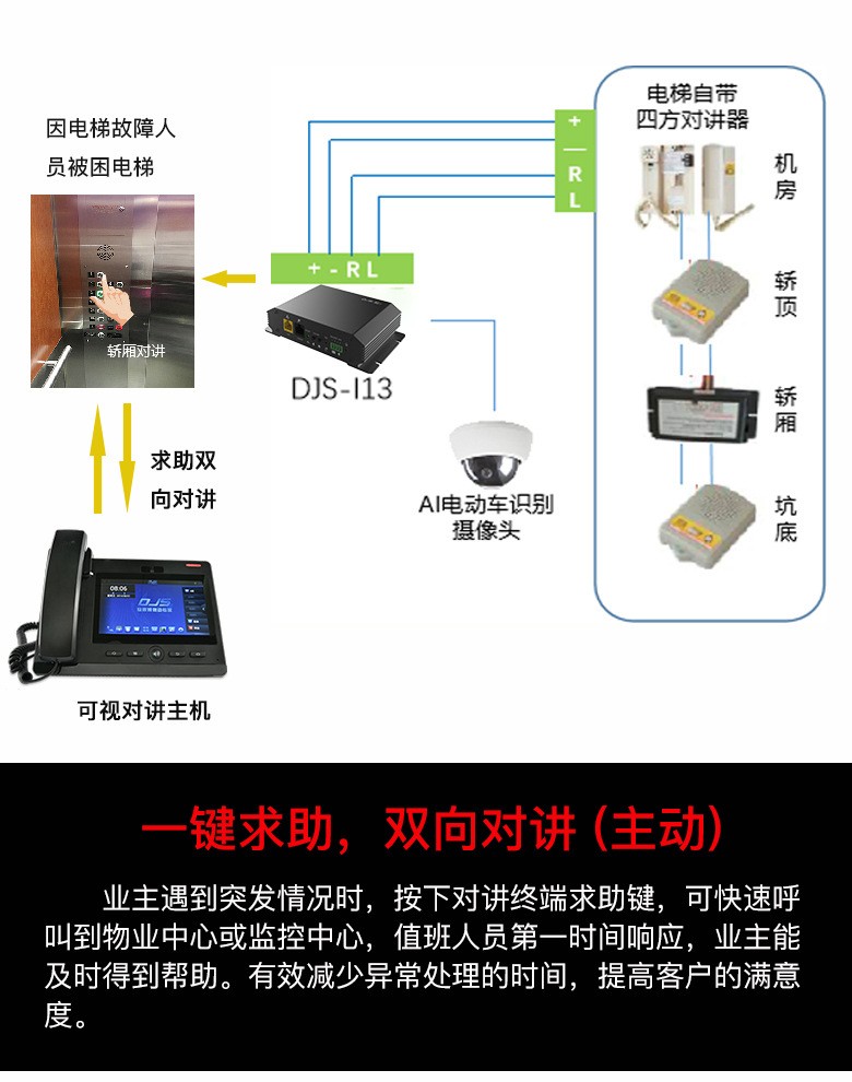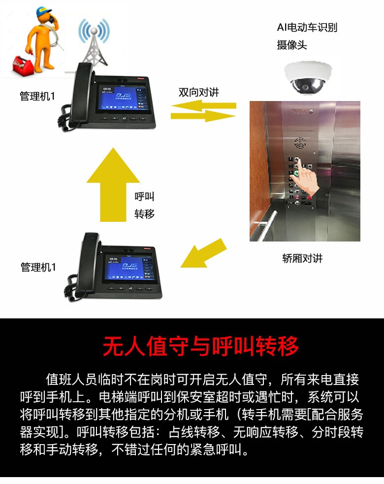 2、 五方對講 通過SIP電梯對講控制網(wǎng)關(guān),與電梯原模擬四 方對講(珠海德凌)實現(xiàn)無縫對接,實現(xiàn)與控 制中心五方對講