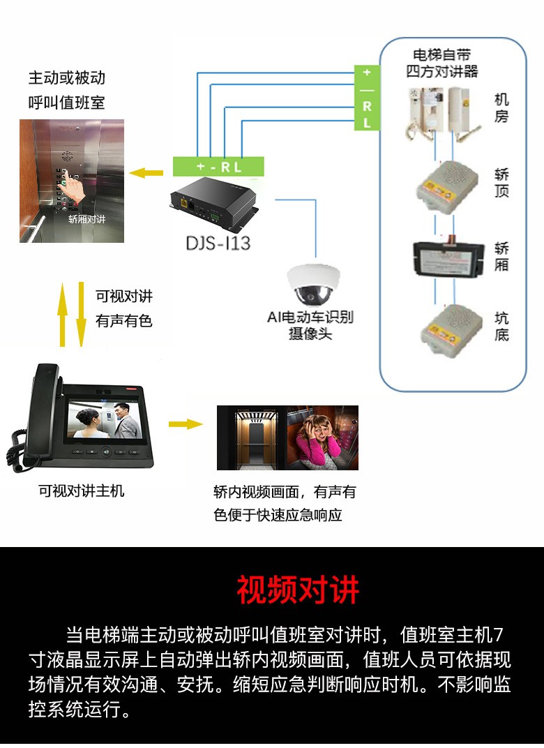 攝像頭識別到電動車后對講控制網(wǎng)關(guān)自動呼叫值班室管理主機(jī)并,聯(lián)動轎內(nèi)AI識別攝像頭在管理主機(jī)上彈出相應(yīng)轎廂視頻畫面,值班人員辨別轎內(nèi)情況與其雙向?qū)χv、溝通引導(dǎo)。(首創(chuàng))