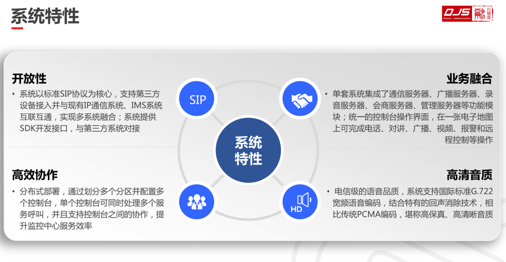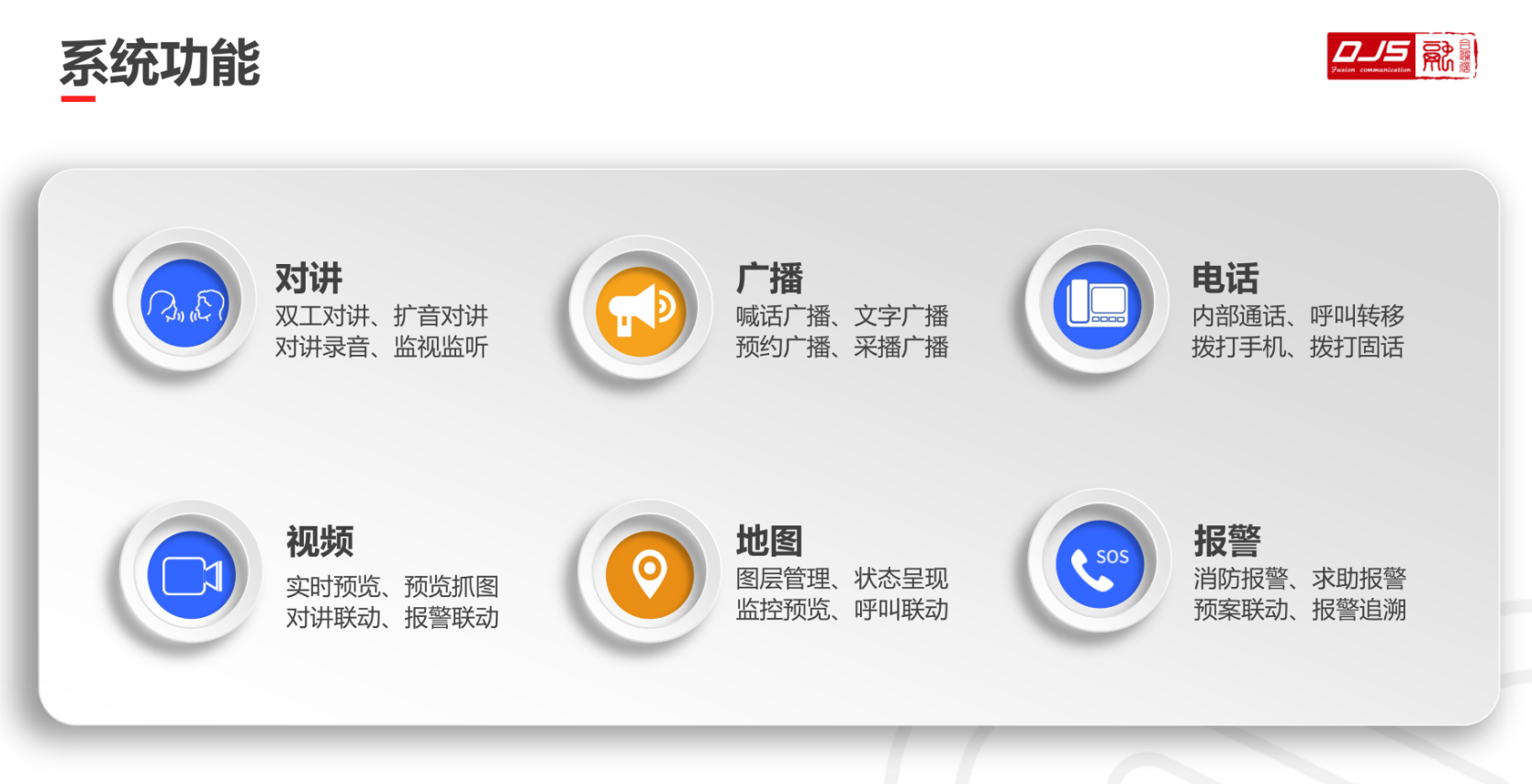 ①直觀的業(yè)務(wù)操作系統(tǒng)集成了通信服務(wù)器、廣播服務(wù)器、錄音服務(wù)器、會商服務(wù)器、管理服務(wù)器等功能模塊;統(tǒng)一的可視化調(diào)度臺操作界
