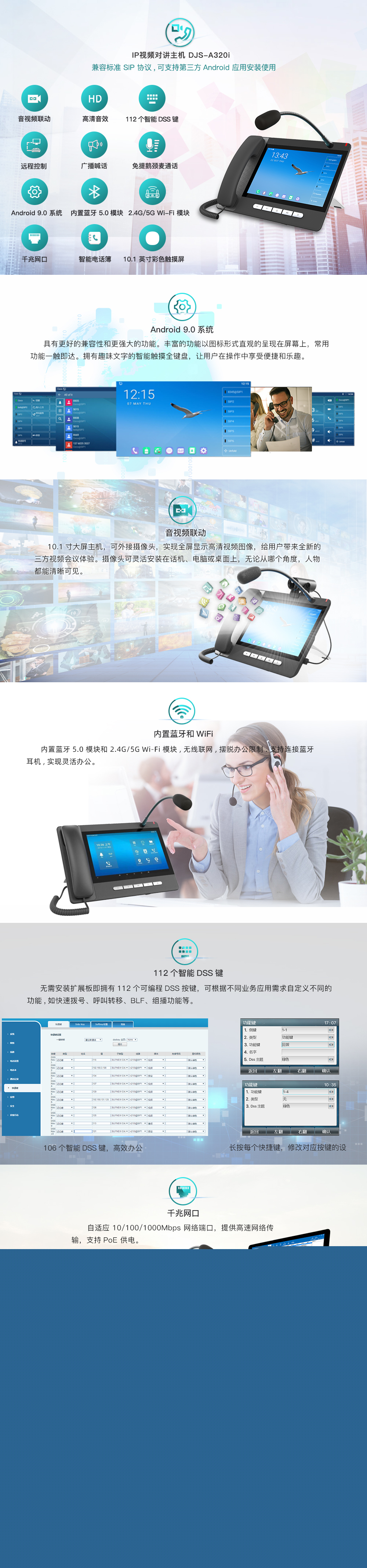 基于 Android 9.0 系統(tǒng),可支持第三方Android 應用安裝使用,界面使用便捷。采用 10.1 英寸彩色觸摸屏,內(nèi)置藍牙 5.0 模塊和 2.4G/5G Wi-Fi 模塊,同時集成USB 2.0 接口。兼容標準 SIP 協(xié)議,可作為監(jiān)控中心、領(lǐng)導辦公室管理主機使用,可對管理轄區(qū)內(nèi)的主機和分機進行呼叫、雙向?qū)χv、監(jiān)聽/監(jiān)視、廣播喊話。A32i 能夠讓企業(yè)最大化地提升日常業(yè)務管理效率和應急情況處理能力。