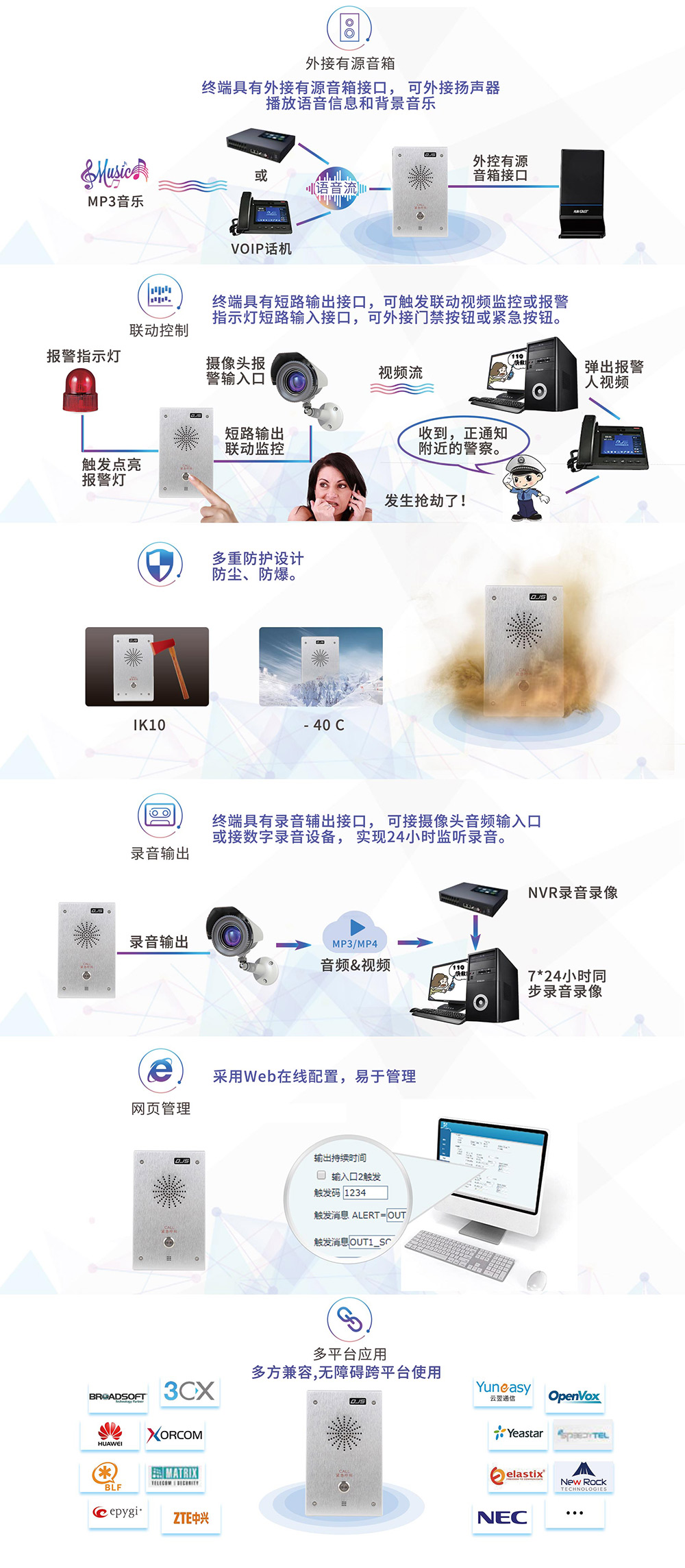 • 內(nèi)置兩組短路輸出。四種受控方式:遠程 DTMF、遠 程服務(wù)器指令、短路輸入聯(lián)動、通話狀態(tài)
